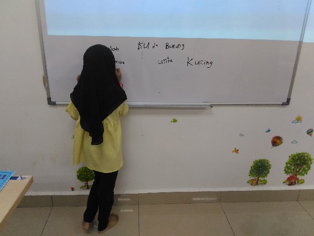 Program ini di mulakan dengan tayang video ABC dan pelajar-pelajar menyebut bersama-sama huruf tersebut secara berulang-ulang. Selepas itu, setiap pelajar disoal bagi meningkatkan kefahaman dalam mengenal huruf ABC dan di minta untuk menulis huruf yang di sebut di papan putih. Selain itu, mereka juga diberikan latihan mengenal huruf dan benda dengan menggunakan kad interaktif yang mengandung gambar dan juga nama benda tersebut. Dengan ini ,kita akan dapat melihat tahap kefahaman pelajar tersebut.