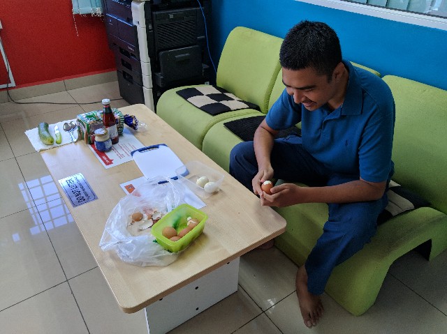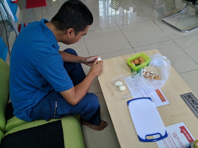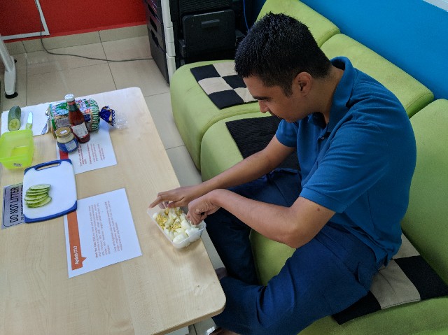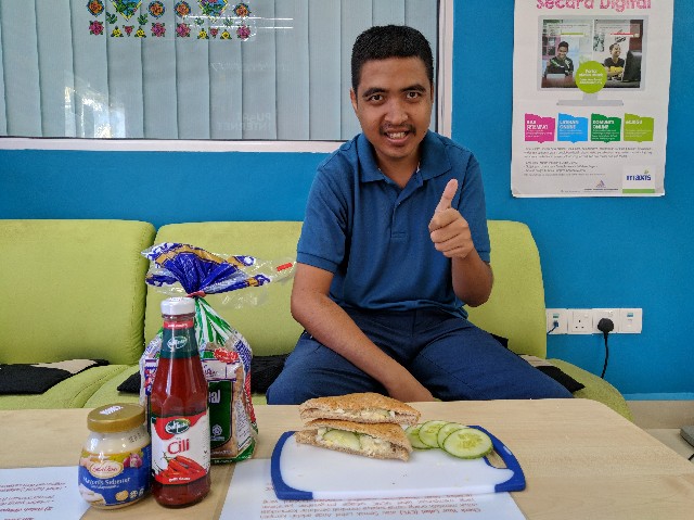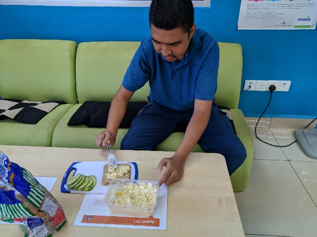 Pada program kali ini, beliau telah diberikan penerangan, panduan dan latihan berkaitan dengan cara menghasilkan sandwich telur. Di awal program, beliau diberikan penerangan berkaitan dengan bahan-bahan yang diperlukan untuk menghasilkan sandwich. Selepas penerangan, beliau diberikan latihan untuk menghasilkan sandwich dari mengupas kulit telur sehinggalah sandwich itu siap. Di akhir kelas ini, beliau telah berjaya menghasilkan sandwich telur tersebut.