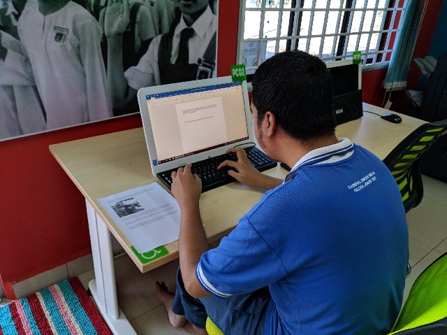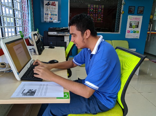 Di awal program, beliau diberikan penerangan berkaitan dengan cara untuk menukar huruf kecil kepada huruf besar dan juga menukar font. Selepas penerangan, beliau diberikan latihan menaip dengan mengikut teks yang telah diberikan. Beliau juga di ingatkan agar menaip dengan betul mengikut pada teks yang telah disediakan. Dengan adanya program seperti ini, golongan Orang Kelainan Upaya ini juga akan mendapat ilmu seiring dengan pekembangan pada masa kini.